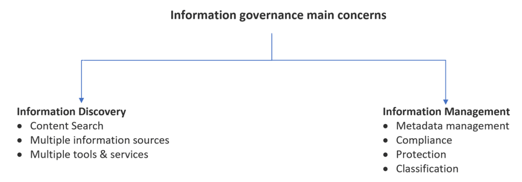 First, it is crucial to understand what is Information Governance. It is a strategic framework for managing information at the organisation level that will allow its staff to discover and access relevant information efficiently and effectively while complying with industry and organisation compliance and standards. Most organisations raise their concerns in information governance based on two categories: