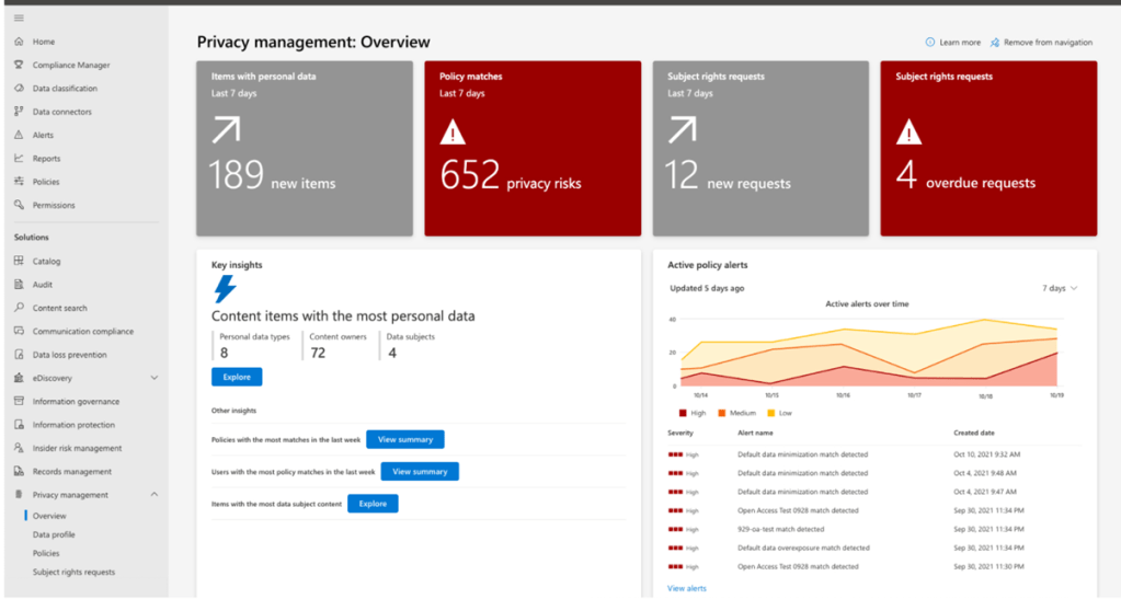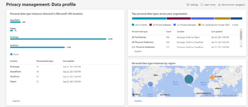 Microsoft has introduced a brand-new AI-based capability under the Microsoft 365 compliance umbrella, which will scan through the environment. It will discover and show how much personal data your organisation has and where it’s stored so as an organisation, you can fix the most significant privacy risks. It also proactively identifies personal data and helps anyone working with personal data to make the right decisions by providing insight into organisational policy details, recommended actions, and links to privacy management training.