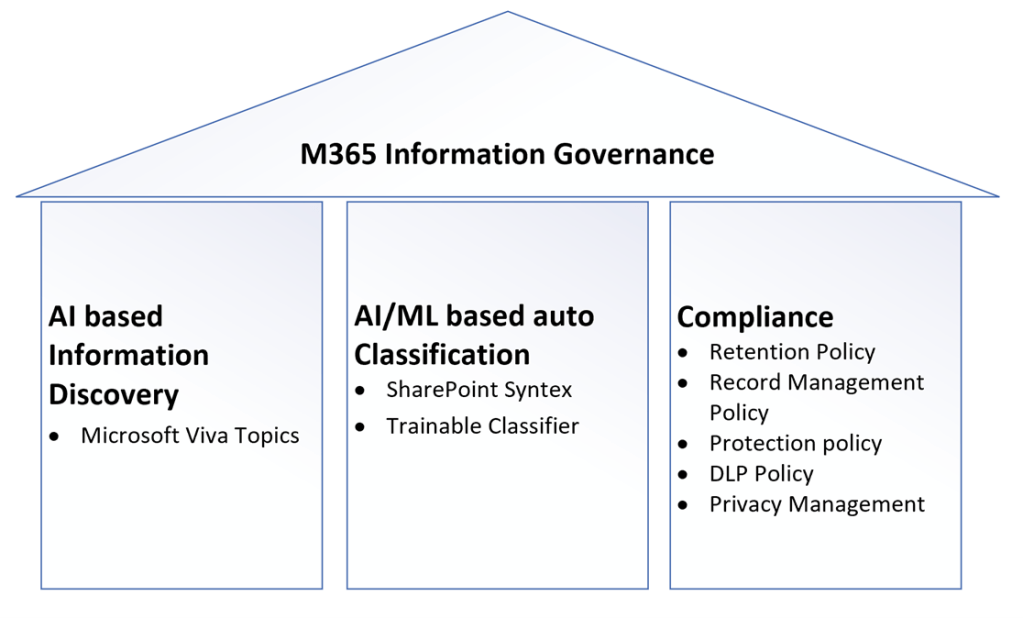 The Microsoft 365 information governance house has been built based on the three pillars as shown below.