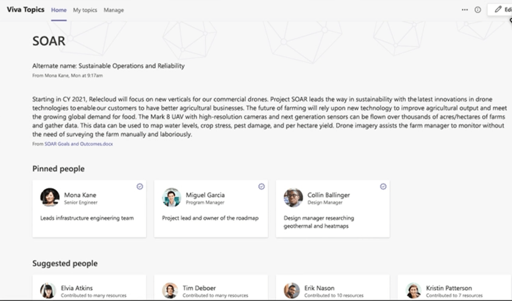 When Microsoft Viva identifies topics, it automatically collects and curates related information by AI capabilities into Topic Page, enabling the organisation’s experts to share knowledge about the topic. The knowledge experts can fine-tune and refine the topic through Topic pages so that AI can learn from the experts’ inputs.