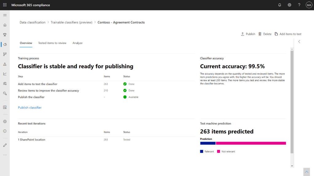 Microsoft’s built-in classifier is readily available for your use to detect and classify popular data categories, such as resumes and source code. Depending on your organisational requirements, you can create custom trainable classifies to identify different types of documents and classify them automatically.